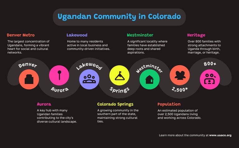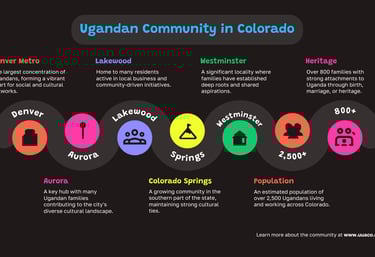 The Ugandan community in Colorado is now significant both in size and in its contribution to the state. It is estimated that there are over 2,500 Ugandans living in Colorado, with more than 800 families having attachment to Uganda—whether by birth, marriage, or heritage. These families are spread across several cities and towns, with a strong concentration in the Denver metro area and notable presence in cities such as Aurora, Lakewood, Colorado Springs, and Westminster, among others. Each of these localities has its own character, but together they form a vibrant, interlinked network of Ugandans who share common roots and shared aspirations.
